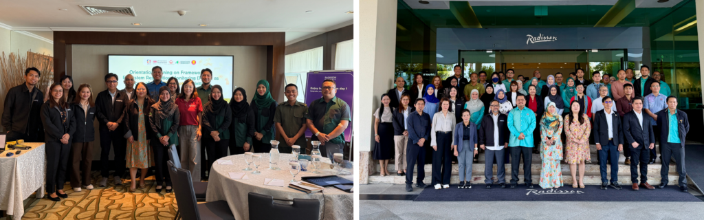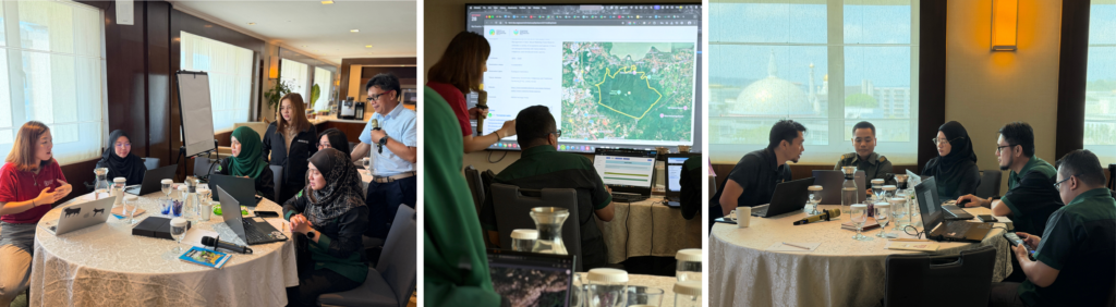Wetland and peatland practitioners, mapping officers, and stakeholders from across the ASEAN Member States (AMS) engaged in capacity development in Brunei, featuring technical training in data management and monitoring (left) alongside educational visits to local wetland and peatland ecosystems (right).
